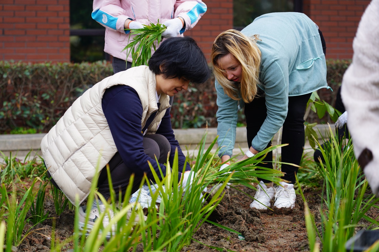 “Today we are going to plant auspicious grasses”, Mr. You Jikun, who taught them to plant said. After learning for a while, all of them mastered the skills and started to beatify the garden. Two by two, line by line, seedlings by seedlings, both teachers and students planted and filled the whole garden with auspicious grasses. It was finished earlier than expected because of everyone’s efforts.