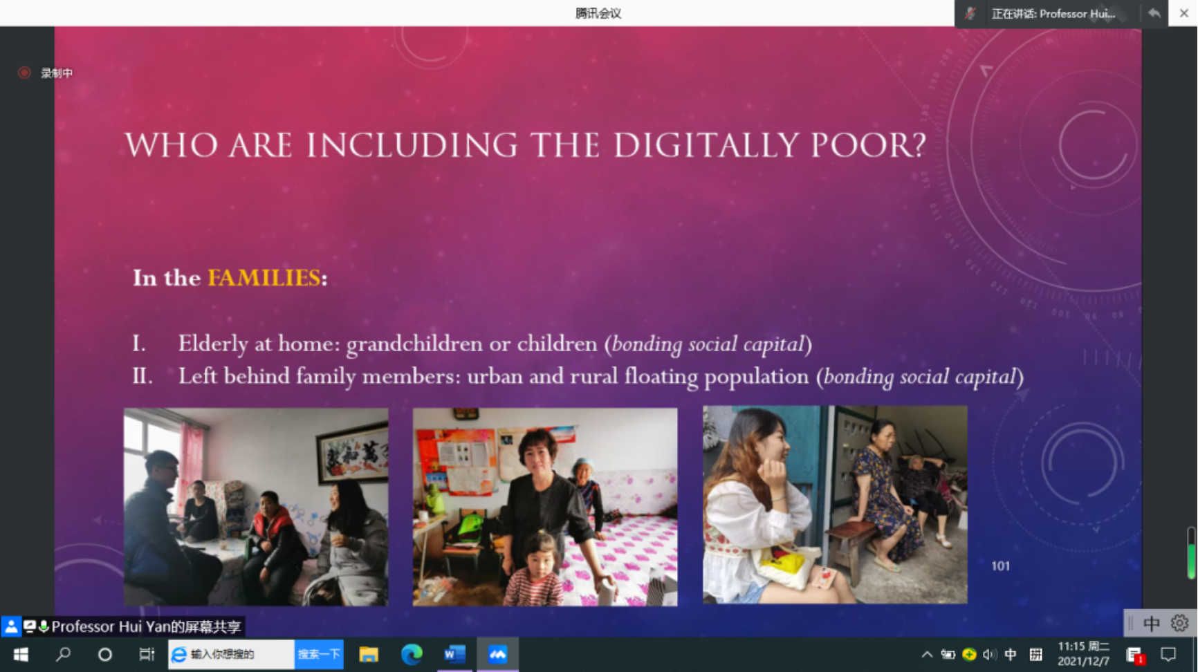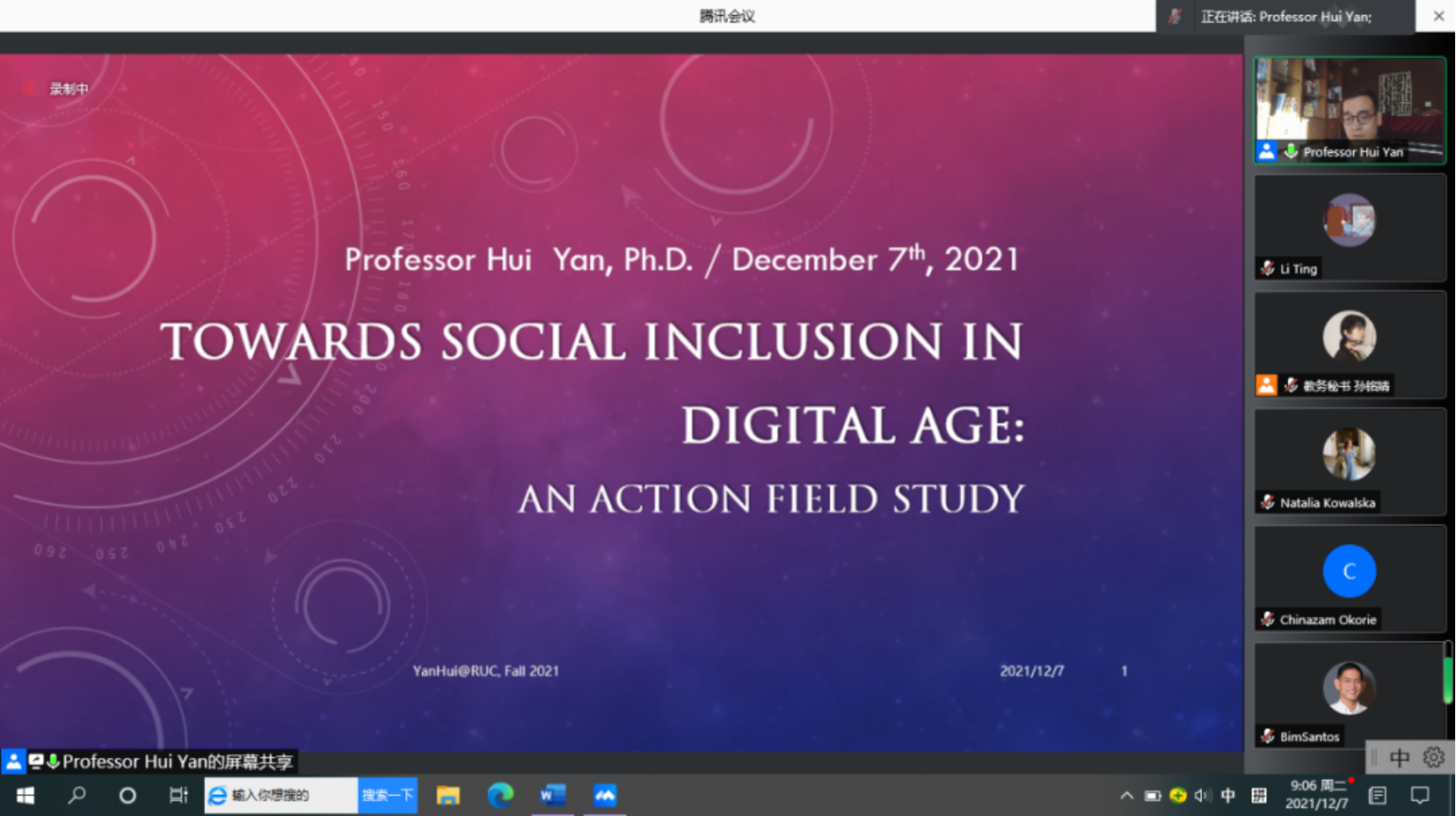 12月7日,*成人动作片 系列讲座——“数字时代的社会融合:以行动研究和田野调查为例”在腾讯会议线上举行。讲座由成人动作片 信息资源管理成人动作片 闫慧教授主讲,2021级全体学生线上聆听讲座。