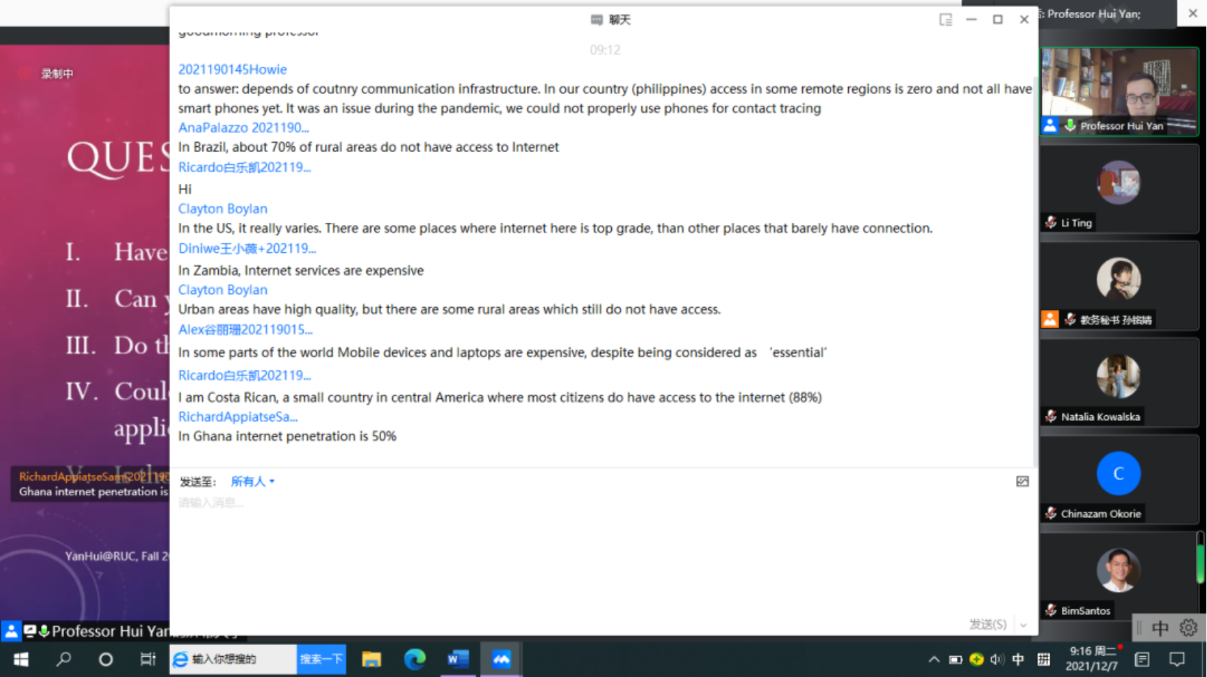 来自美国、俄罗斯、巴西、津巴布韦等国家的同学就本国移动互联网的使用情况与老师积极交流,同时也让其他同学了解了不同国家的实际情况。闫老师总结道,虽然各个国家的具体情况不同,但是各国都存在一些普遍的问题,如移动数字鸿沟。