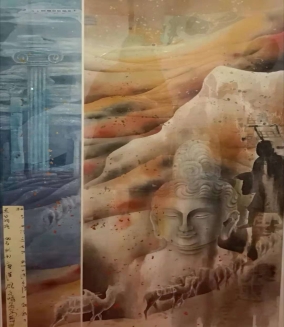 “壮志西行近古踪,孤烟大漠夕阳中,驼铃古道丝绸路,胡马尤闻唐汉风”。书画作品《新丝路》在开幕式上备受关注。书画艺术家齐松紧扣主题,巧妙地将佛像、罗马柱、沙漠、骆驼、高铁、古丝路地图等多个元素融为一体,汇聚中西、纵贯古今。