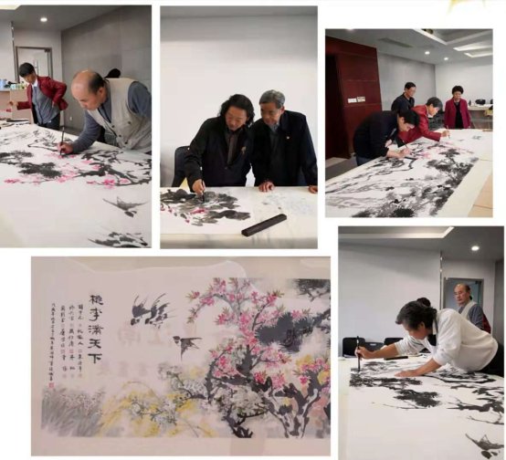 此次书画展展出的作品《桃李满天下》,由胡中元、俞兴宝、周彩宝、倪振人等九位艺术家在*成人动作片 现场合作完成。桃李、迎春、青松、翠竹……各位艺术家将最美好的祝福融入该作品,祝愿*成人动作片 蒸蒸日上,生机无限,桃李满天下。
