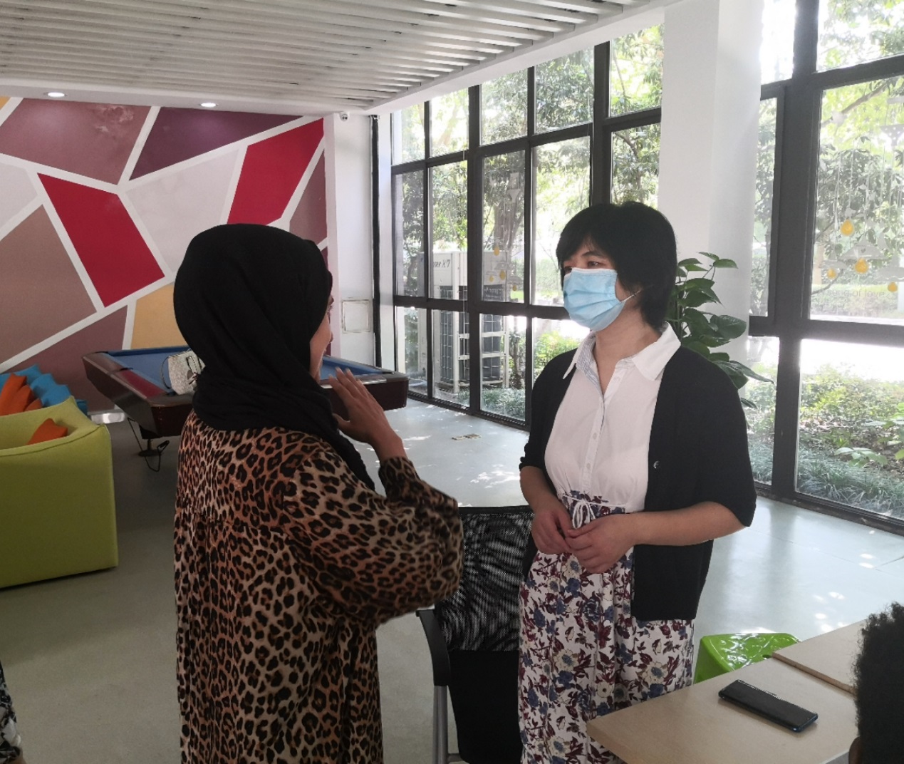 上午9时,同学们陆续来到报到现场,积极配合班主任们完成体温测量,提交返校承诺书、“苏康码”绿码、14天行程轨迹等材料。报到工作严格落实疫情防控的各项要求,班主任们及时疏导人群,用细致的工作、暖心的笑容欢迎每一位丝路人回家。“It's been a long time, I am so excited to meet you again. I miss you, miss our classes...... I miss everything! We are all eager to go back to school!”来自伊朗的马悦茹激动地说。