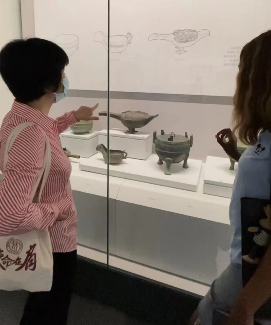 随后,师生一行来到“风雅颂吴中”展馆,该展馆由吴雅、吴风、吴颂三个平行展览组成,对吴文化进行了更为细致全面的解读。“吴雅”琳琅满目的玉器、瓷器、金银器、漆器展现了江南的富庶与雅致,“吴风”着重展现了吴地风物与古镇古建筑,“吴颂”则在吴语侬侬中蕴藏着化不开的乡音与乡愁,涵养着吴地先贤的梦中归宿。江晓丽结合展厅现场文物,从风物、人情、地理再到雅颂的传承等方面,全方位介绍了吴文化在历史阶段的变迁与发展,生动诠释了吴文化的内涵与精髓。